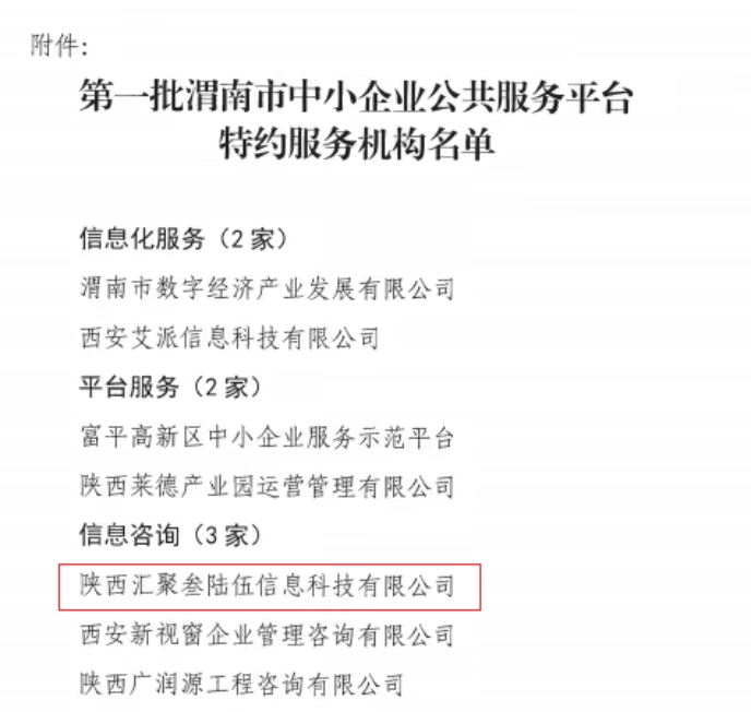 5月26日,渭南市工业和信息化局公布首批中小企业公共服务平台特约服务机构名单,伟德官网大学科技园入驻企业陕西叁陆伍信息科技有限公司凭借其在企业服务领域的专业能力与突出贡献成功入选,成为首批中小企业公共服务平台特约服务机构。