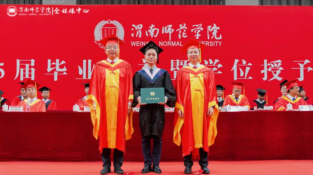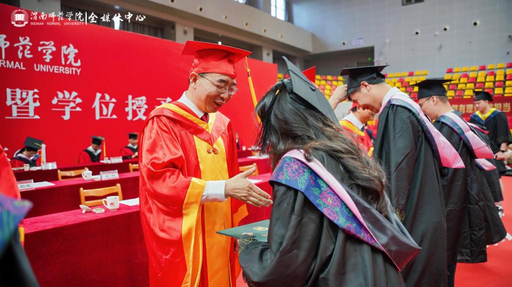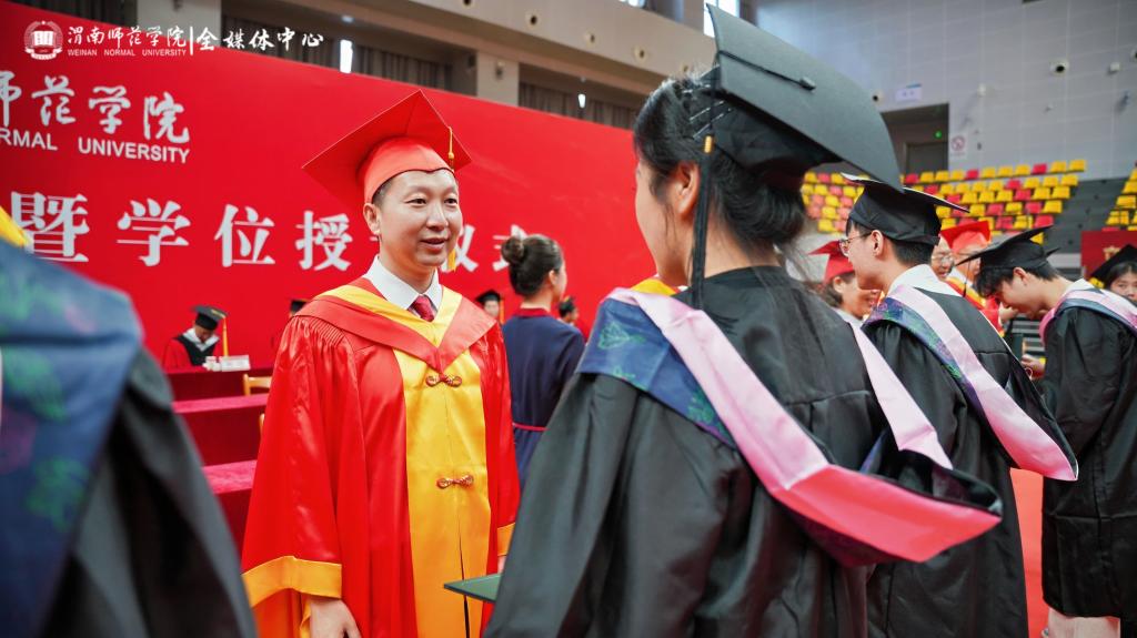 李强代表学校向毕业生们致以热烈的祝贺和衷心的感谢,祝贺同学们顺利完成本科阶段学业,走向人生更广阔的天地。李强勉励所有毕业生,青春不散场,奋斗正当时。他结合2025年陕西高考作文题目“如果有一天,我们能够将梦赠予他人”,向广大毕业生赠送了四个梦:一是传承文化基因、坚定文化自信的“传薪者之梦”,勉励大家发挥专业所长,推动中华文化走向世界,将个人成长汇入文化传承的洪流;二扎根中国大地、服务国计民生的“蒲公英之梦”,希望大家“向下扎根,向上生长”,牢记“至诚报国”的校训精神,把个人理想融入国家发展伟业;三是提灯引路育才、启智润心弘道的“教育家之梦”,在未来的岗位上,坚守教育理想、传承教育情怀、创新教育实践、奉献教育事业,做新时代的传灯人,筑梦人;四是拥抱时代变革、引领创新发展的“弄潮儿之梦”,提醒大家要保持终身学习的态度,善于识变求变,以人文精神为灯塔,以科技思维为引擎,勇立时代潮头,迎接人生挑战。“无论你们走得多远,渭师永远是你们的精神家园”,在祝福同学们前程似锦、梦想成真的同时,他叮咛大家“常回家看看”。