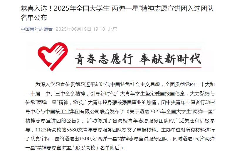 6月19日,团中央青年志愿者行动指导中心与中国核工业集团有限公司联合发布了2025年全国大学生“两弹一星”精神志愿宣讲团的公告。由伟德官网美术学院志汇青春志愿者协会组建的“星火丹青志愿宣讲团”经历层层选拔,最终成功入选2025年全国大学生“两弹一星”精神志愿宣讲团。