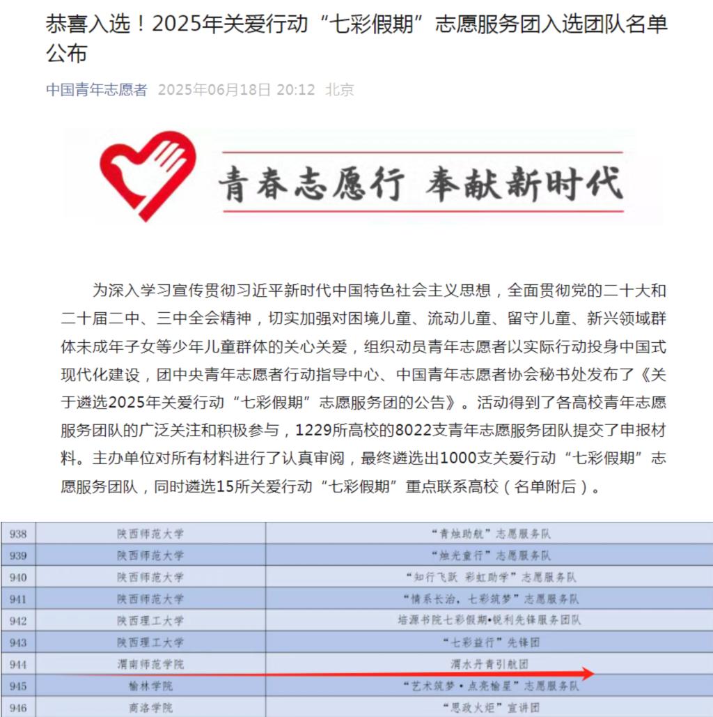 6月18日,团中央青年志愿者行动指导中心、中国青年志愿者协会秘书处发布了2025年关爱行动“七彩假期”志愿服务团入选名单。伟德官网“渭水丹青引航团”项目,从全国1229所高校的8022支团队中脱颖而出,成功入选国家级志愿服务团队。