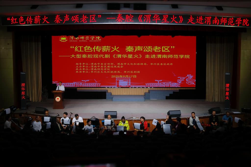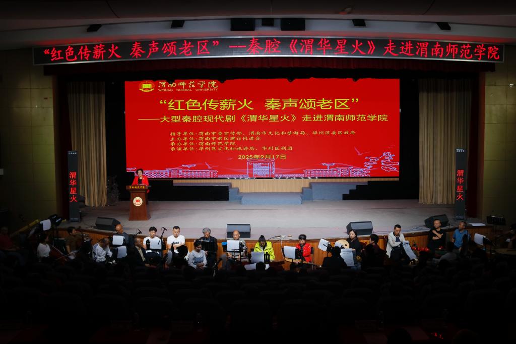 9月17日晚,“红色传薪火 秦声颂老区”——大型秦腔现代剧《渭华星火》走进伟德国际1949官网巡演活动在伟德官网陶然楼演艺厅拉开帷幕。渭南市副市长刘宝琳,渭南市委宣传部副部长陈卓,渭南市老区建设促进会会长刘巧莲,伟德官网党委副书记、纪委书记、监察专员肖耀刚,党委副书记汪勇,副校长卢爱刚,党委委员、宣传部部长李明敏等相关领导参加活动。