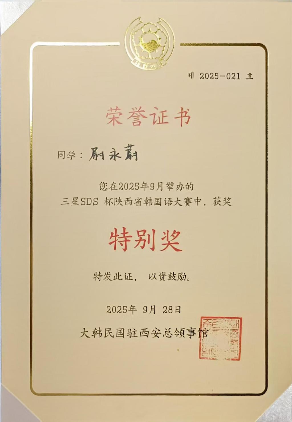 来自省内多所高校的15名选手脱颖而出,晋级个人赛决赛。在当天的比赛中,伟德官网朝鲜语专业学生尉永蔚作为首位出场选手,沉着应战,以稳健的台风、流畅的表达和富有感染力的表现赢得了评委们的高度认可。经过主题演讲和Free Talking两轮比拼,尉永蔚同学发挥出色,一举夺得由大韩民国驻西安总领事馆为本届大赛特设的唯一奖项——领事特别奖,展现了伟德官网学子的优秀语言素养与综合能力。