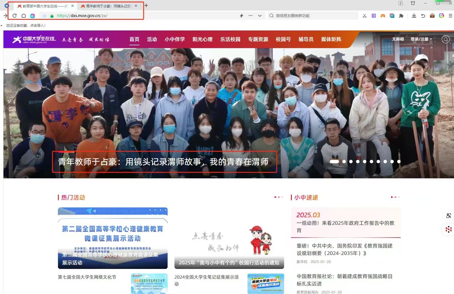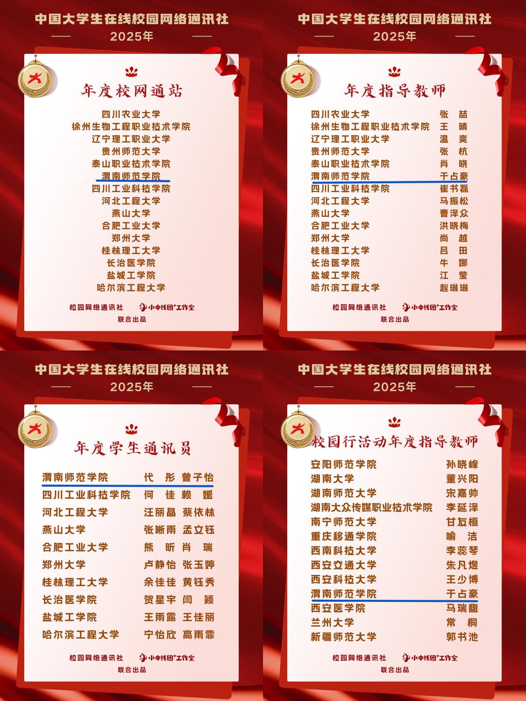 2025年,在教育部中国大学生在线的指导下,学校宣传部主管的电视台等学生记者队伍依托中国大学生在线校园网络通讯站,全年在全国大学生在线校园号发布原创图文、视频内容30余篇,数量与质量均创历年新高。围绕全民国家安全教育日、国庆节等时间节点精心策划并上线了“青春渭师”等多个品牌栏目。“校园行”活动贯穿全年,主题鲜明,全年开展了“绿植篇”“运动篇”“毕业篇”等8次主题活动,其中校园号发布8次,学校微信公众号、微博发布21次。多篇报道被中国大学生在线官网首页和官方微博采用。