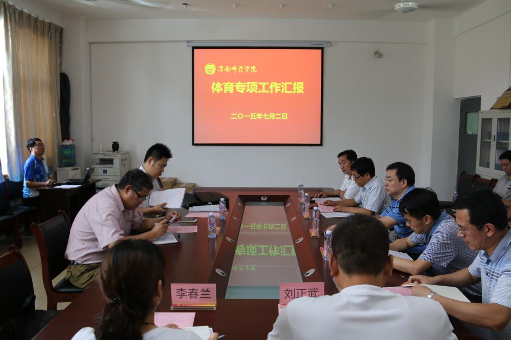 7月2日下午,教育厅体育工作督查组省学生体协常务副秘书长张原耕一行来伟德官网检查指导工作。副院长程书强,体育学院院长张虎,教务处副处长刘军、席景奇,体育学院党政领导及体育教育专业建设负责人、实验室主任、教研室主任等参加了汇报会。会议由教务处处长李尧龙主持。