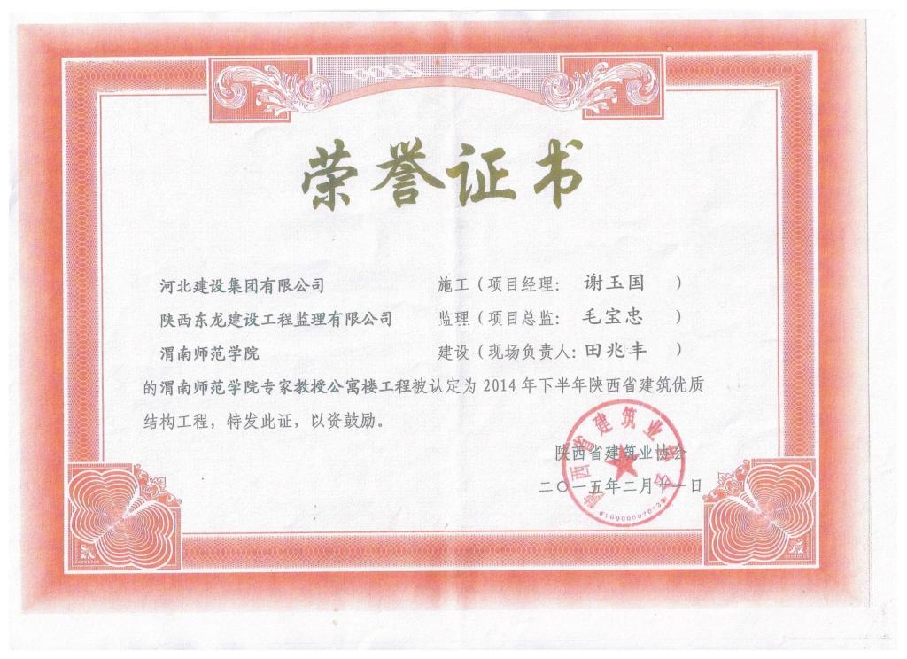 近期,经陕西省建筑业协会组织专家现场检查,省建筑优质结构工程专家评审委员会认定,伟德官网专家教授公寓楼工程被评为2014年度下半年陕西省建筑优质结构工程,获得表彰。