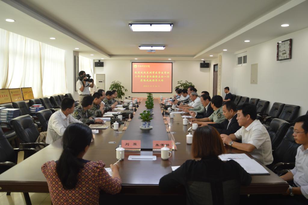 9月24日上午,兰州军区学生军训工作办公室主任汪海涛大校、参谋张文璞、陕西省军区军训办公室主任成龙昌大校、办公室参谋程来杰、边防学院业务教研室主任杜空军等一行7人莅临伟德官网检查指导2015级学生军训工作。校党委书记张金安,承训部队团长霍卫华,副院长王君龙,党委委员、组织部部长杨小渭,党政办公室主任韩小卫,人武部部长崔启,学工部部长王俊安,教务处处长李尧龙,保卫处处长王争辉,团委书记姚明亮及军事理论课教师代表陪同检查。