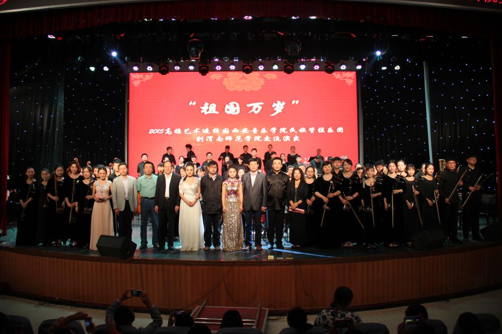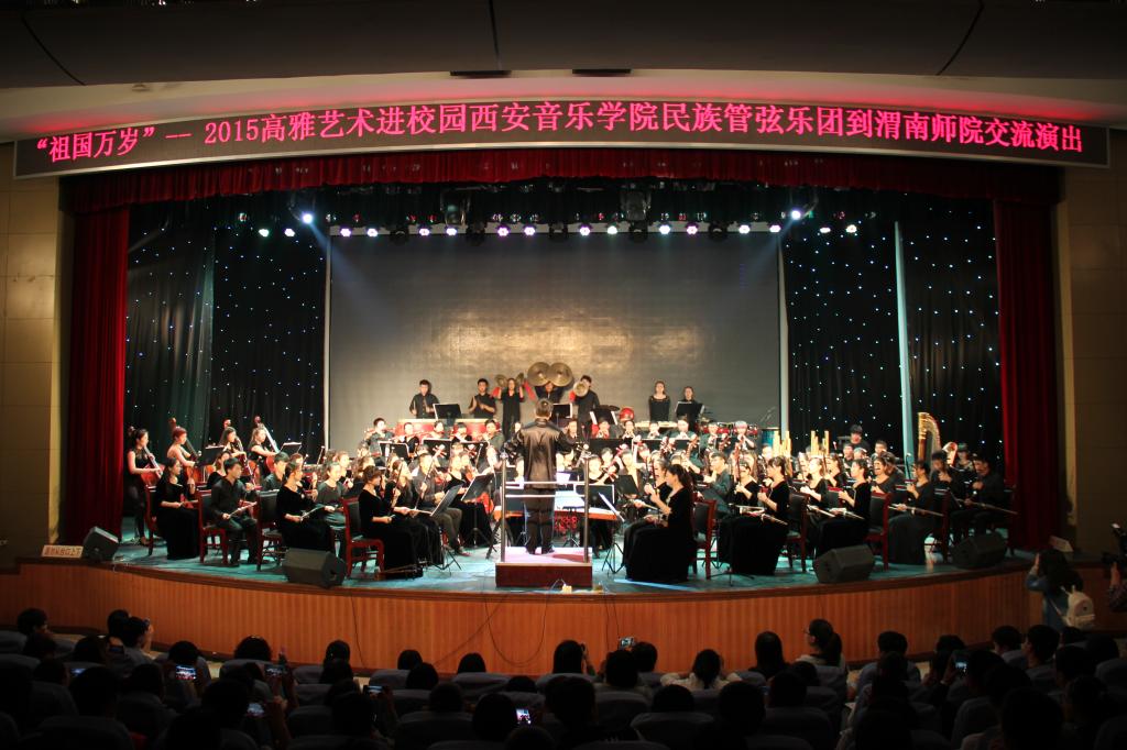9月29日,伟德官网举行以“祖国万岁”为主题的迎国庆系列活动,特邀西安音乐学院民族管弦乐团来校交流演出,这既是我省2015年高雅艺术进校园活动的重要演出,也是伟德官网喜迎国庆66周年系列重要活动。学校纪委书记任健,副校长程书强,副校长李海龙、党委委员、组织部部长杨小渭,西安音乐学院艺术处处长刘宝玲,民乐系副主任高晓鹏,民乐团团长赵鸿宾出席活动,学校各部门、院系领导领导、学生代表300余名观看演出。