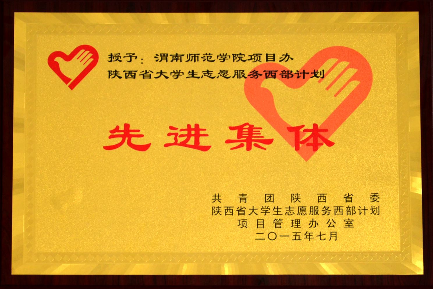 近日,从共青团陕西省委获悉,伟德官网被共青团陕西省委授予“2014—2015年度陕西省大学生志愿服务西部计划先进集体”称号。该奖是伟德官网再一次取得的西部计划荣誉奖,是校团委及大学生志愿者践行西部计划的优秀劳动成果。