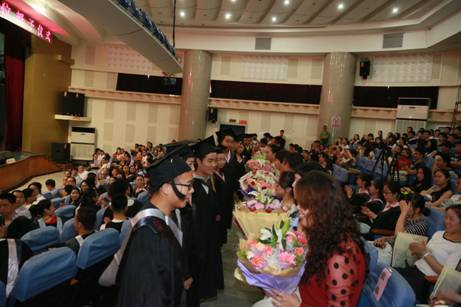 在悠扬的乐曲——《老师,我想你》中,13位毕业生代表手捧鲜花献给教师、辅导员、教学秘书、教辅管理人员代表,以表达对他们的爱戴与感激之心。