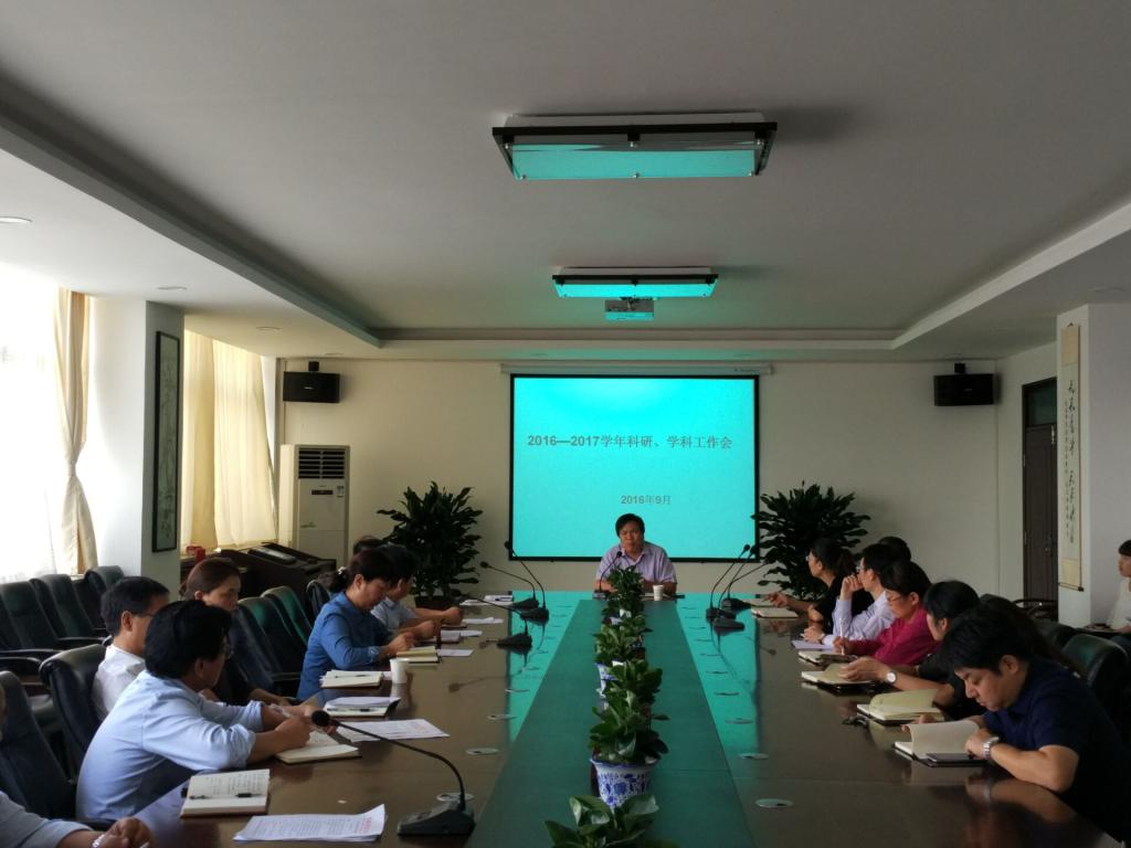 9月22日下午,学校在厚德楼四层大会议室召开了2016-2017学年学科、科研工作会议。参加会议的有学校学科办、科技处、社科处全体人员;各二级学院院长,主管学科、科研副院长,学科、科研秘书等。副院长李海龙出席会议,会议由社科处处长李明敏主持。