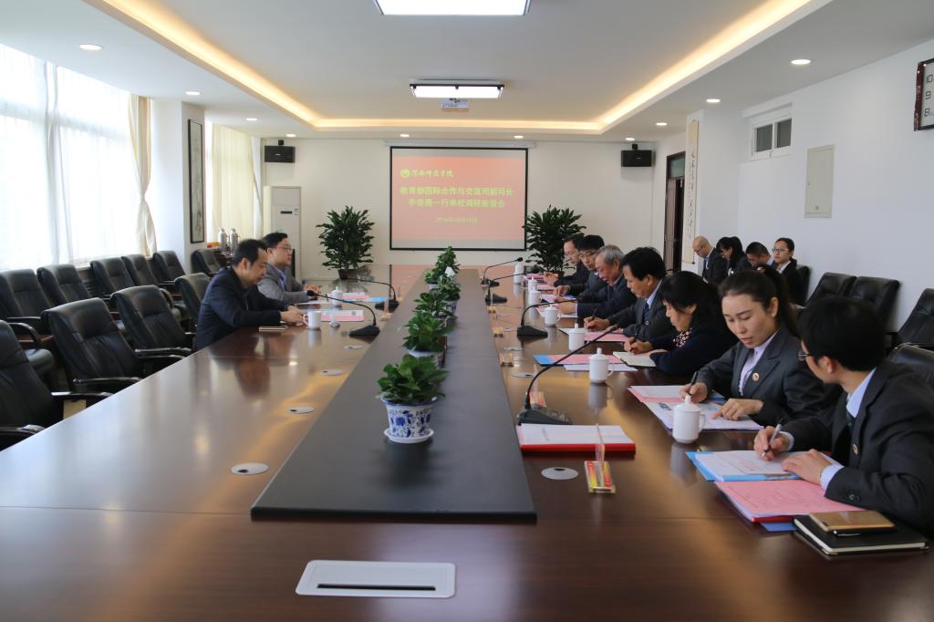 10月14日上午,教育部国际合作与交流司副司长李奇勇一行来伟德官网调研并召开座谈会。省教育厅国际合作与交流处副处长文通等陪同调研。校长助理韩小卫,学术委员会主任委员王菊霞,国际合作与交流处处长杜百顺,莫斯科艺术学院院长梁晶、副院长李波、李富贵等参加了座谈会,会议由副校长李海龙主持。
