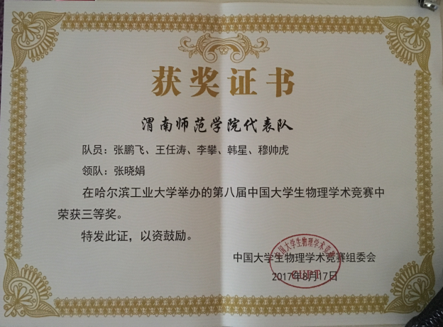 8月13日至17日,第八届中国大学生物理学术竞赛(简称CUPT)在哈尔滨工业大学如期举行,来自南开大学、清华大学、浙江大学、南京大学、复旦大学、西安交通大学等73所高校的74支代表队参加了本次竞赛,另有26所高校派队观摩了此次比赛。伟德官网今年首次组队参赛,经过几轮校内赛和陕西省省赛,最终选拔出1个参赛队参加此次比赛,在经验不足、仪器有限等情况下,师生克服种种困难,经过与西南交通大学、哈尔滨工业大学、华中科技大学、渤海大学、北华航天工业大学、华东师范大学等高校经历5轮共20场的激烈辩论,最终荣获全国“三等奖”。