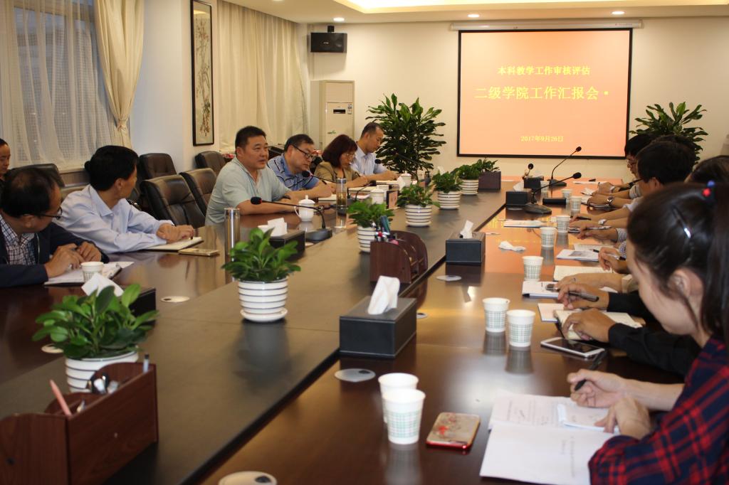 会上,各二级学院院长分别采用PPT详细汇报了本学院概况、各类专业培养目标定位、师资队伍、教学资源、培养过程、学生发展、质量监控、人才培养成效等方面的工作,参会人员分别就其中存在的问题与不足,提出改进意见和建议。