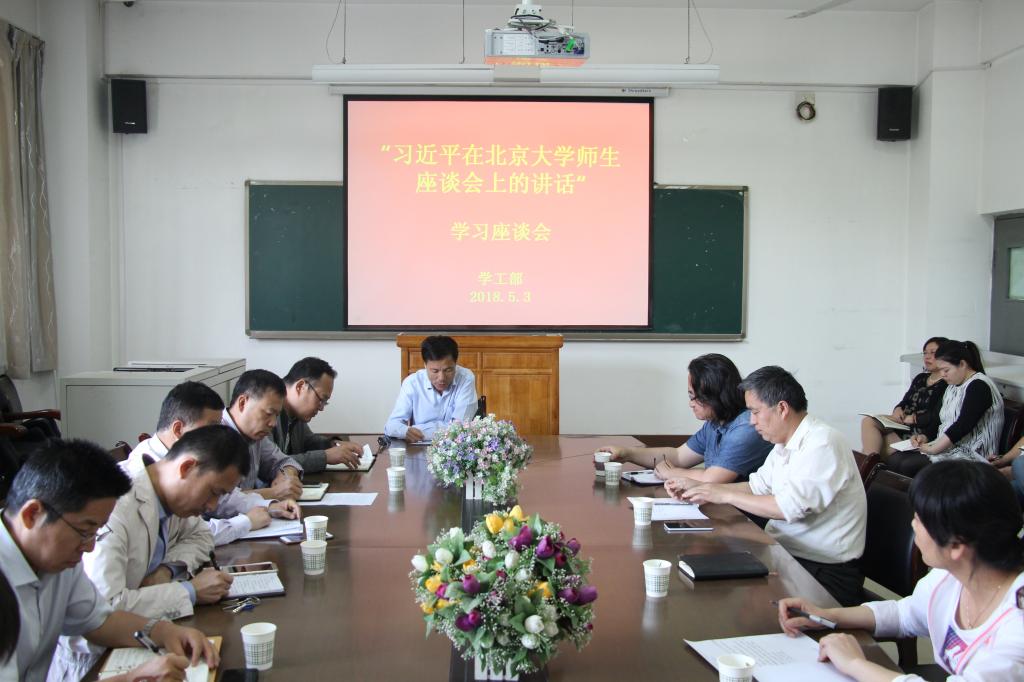 5月2日上午,在“五四”青年节和北京大学建校120周年校庆日来临之际,习近平来到北京大学考察。习近平总书记在与北大师生座谈时发表了重要讲话,在师生中引起了强烈反响,振奋着每一名青年学子的心。5月3日下午,伟德官网学工部率先组织二级学院主管学生工作副书记与部门全体工作人员开展学习座谈会。学工部部长王俊安带领与会人员集体学习了“习近平在北京大学师生座谈会上的讲话”与纪实文学《梁家河》首发式的通讯报道。