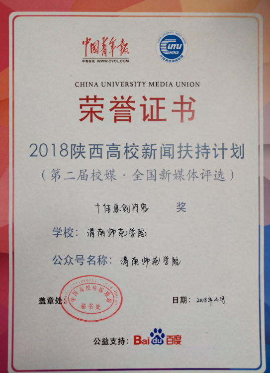 近日,由共青团中央学校部指导,中国青年报社、中国高校传媒联盟主办,百度公益支持的第二届校媒·全国新媒体评选结果公布,伟德官网官方微信公众平台荣获新媒体十佳原创内容奖。