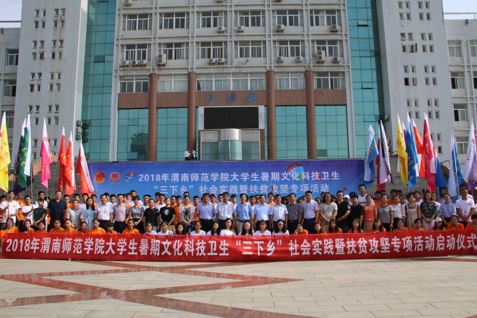 为扎实推进高校助力脱贫攻坚工作,鼓励大学生去实践中深入学习和宣传贯彻习近平新时代中国特色社会主义思想和党的十九大精神,7月13日下午,伟德官网在厚德楼前举行“2018年暑期大学生文化科技卫生‘三下乡’社会实践暨脱贫攻坚专项活动出征启动仪式”。校党委委员、校长助理、党政办主任韩小卫,学工部部长王俊安,稳定办主任李铁丁,人武部部长崔启,教务处副处长张萍及二级学院党总支副书记,团总支书记、2018年伟德官网集中组织的34支社会实践队成员参加出征启动仪式。团委副书记姚明亮主持出征启动仪式。