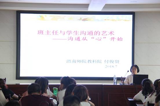 19日上午,中国心理学会会员,渭南市先进教育工作者付俊贤教授进行了题为“班主任与学生沟通的艺术---沟通从开始”的报告,指出现在青少年普遍存在的心理问题,重点对初中生的心理特点作以分析,对如今“班主任难当,学生难教”的情况进行了多元分析。随后付俊贤向大家分享了班主任与学生沟通的艺术,指出班主任工作应从“心”做起,学会“尊重、热情、真诚、积极关注”,学会观察学生,善于在平时交往中了解学生,与各科老师通力合作,为学生的发展搭起坚实的平台。