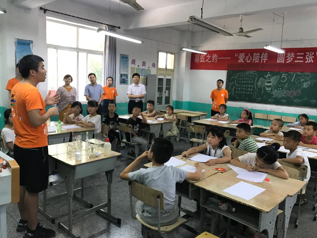 在三张镇中心小学,化学与材料学院党总支副书记杨帆、带队老师张小苗介绍了2014年以来 “彩虹之约”支教团队开展“爱心陪伴 圆梦三张”实践活动的基本情况,支教团队连续五年开展特色支教,设计交通安全教育现场教学等,为三张镇留守儿童送关爱。学校领导还看了小朋友的生物标本作业、观摩了生动的趣味化学课,支教团队学生细心演示化学实验,小朋友们积极踊跃回答问题。支教团队负责人李春环同学说,来这之后深深感到一种责任和使命,一方面代表学校来支教,深感责任重大,另一方面家长把孩子交给我们是一种信任,不能辜负家长的期望,要真正给孩子们带来有用的东西。