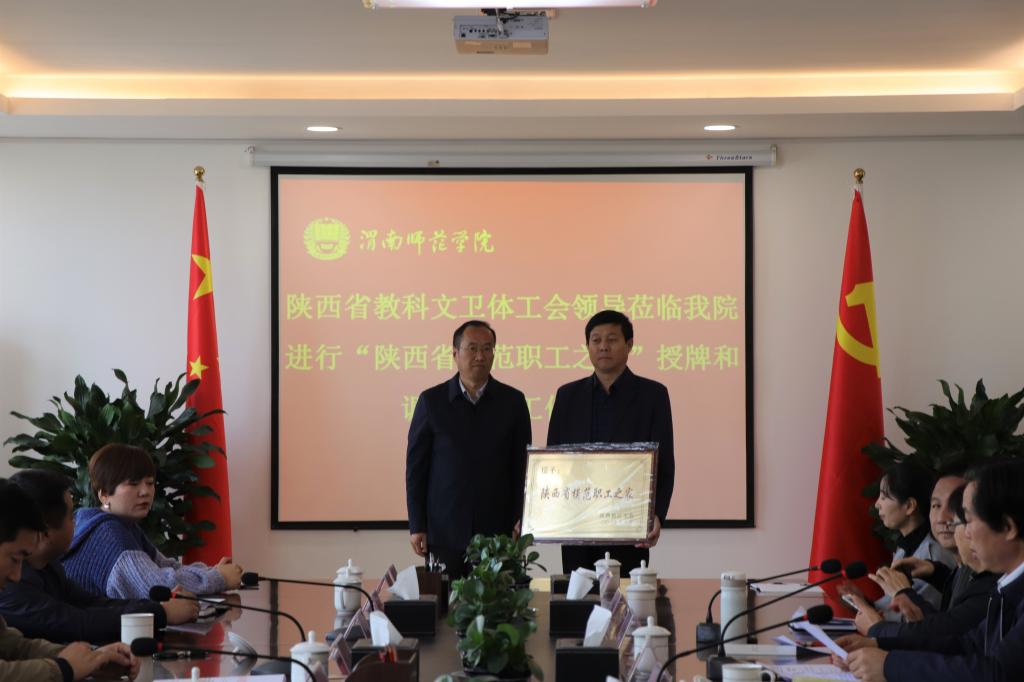 10月30日, 陕西省教科文卫体工会主席陈建树一行莅临伟德官网进行“陕西省模范职工之家”授牌和工会工作调研活动。授牌仪式和调研座谈会在我院厚德楼四楼会议室举行。省教科文卫体工会主席陈建树,省教科文卫体工会副主席陈鹏,伟德官网党委副书记、工会主席任健,院党政办公室副主任张勤恳,工会常务副主席王对启,副主席杨秀香和部分分会主席,教职工代表参加了授牌仪式和座谈会。授牌仪式和座谈会由院工会常务副主席王对启主持。