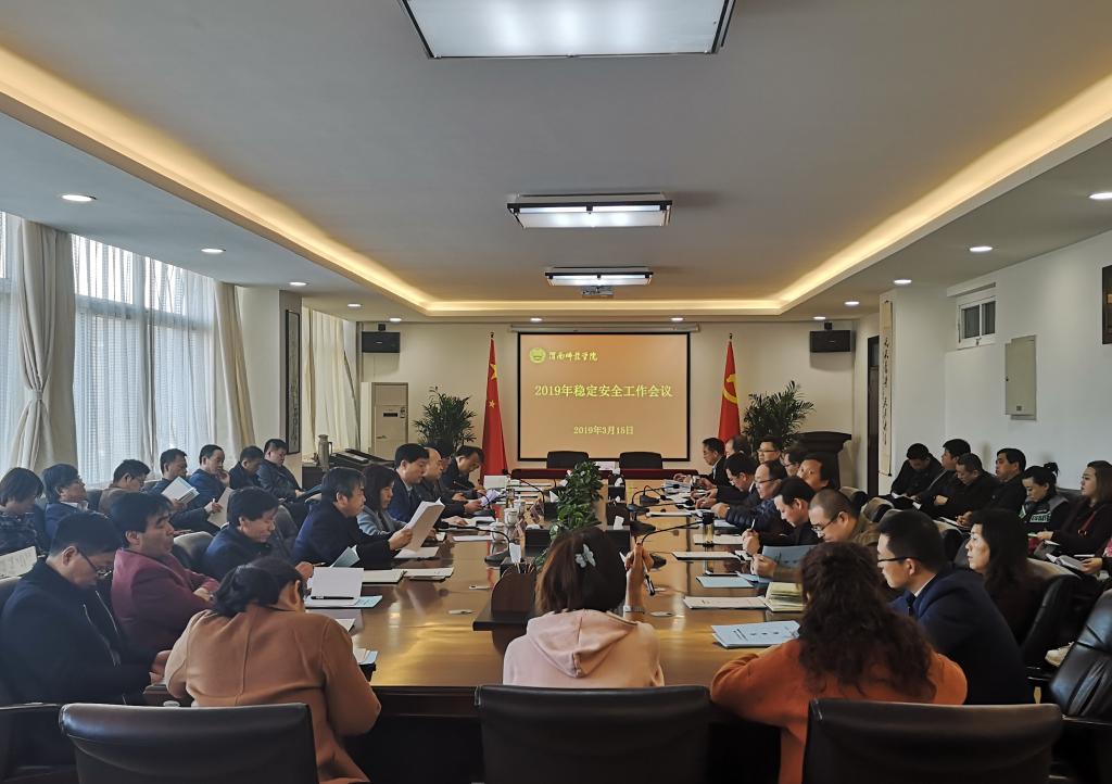 3月15日上午,学校在厚德楼第二会议室召开2019年稳定安全工作会议,深入贯彻全省教育系统全面从严治党工作视频会议精神,落实省委教育工委、省教育厅对高校稳定安全工作要求,回顾总结2018年学校稳定安全工作,研究部署2019年工作任务。党委副书记任健,副校长卢爱刚、王菊霞出席会议,各职能部门负责同志,二级学院院长、主管学生工作副书记,稳定安全办公室、保卫处科级以上干部参加会议。会议由任健同志主持。