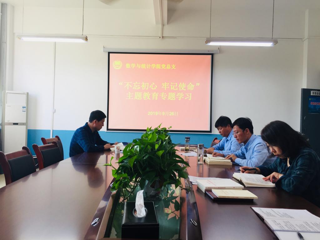 为扎实推动“不忘初心、牢记使命”主题教育有力有序开展,9月26日下午,数学与统计学院召开“不忘初心、牢记使命”主题教育专题学习讨论会。校党委副书记任健出席会议,数学与统计学院党总支书记张同琦,院长陈斌,党总支副书记张菊梅,副院长戴磊参加会议。