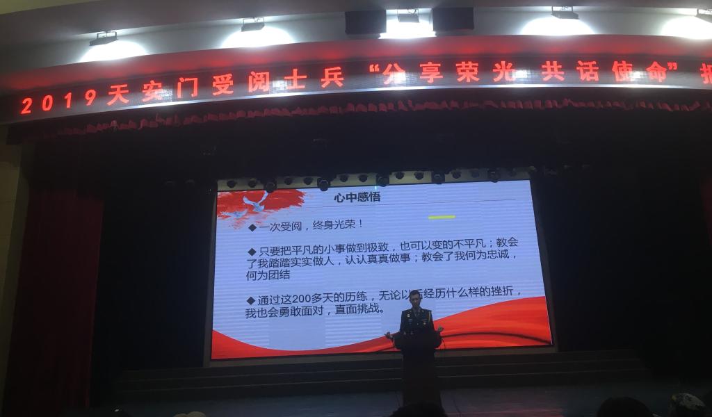 报告会第一阶段由受阅士兵翟康德讲述自身的选拔经历、训练经历及亲身感受。他首先列出几组数字——200多天、每周6.5天、每天11小时、每天6餐饭、40瓶水、96米、128步来描述集训生活。他讲到,阅兵选拔是非常严格的,训练是挑战极限的,受阅士兵的状态是积极敢拼的,一路走来是艰难困苦的。但因为有梦想,因为有追求,因为心系祖国,每一个人都拼尽全力做到最好。因为自我要求严格,训练积极刻苦,他多次被评为每日之星,并表彰为忠诚尖兵,训练标兵!最终获徒步方队指挥部嘉奖,并受到了习近平主席的通令嘉奖!