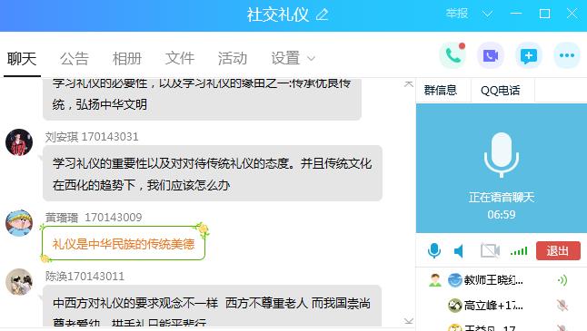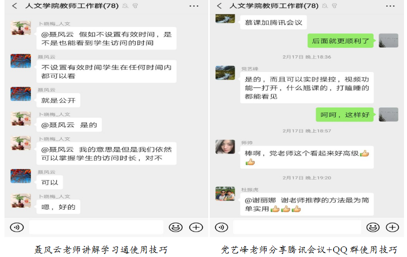 1.建立学习平台技术交流小组。针对文科老师教育技能力先天不足和畏难情绪,学院鼓励督促教师居家抗疫的同时,主动学习求变,积极参加人事处关于信息化教学能力培训线上课程;要求教师及时搜集整理试验相关网络平台的操作使用手册。针对不同学习平台,以技术熟练的老师为组长,形成了教学平台小组。王晓红老师的“云班课”教学组,姚亦登老师的“钉钉”教学组,聂风云老师的“学习通”教学组,孙慧玲老师的“优慕课”教学组,党艺峰老师的“腾讯会议”教学组等,利用各种渠道不断沟通交流,提高教育技术的使用能力,小组内部提供即时的在线技术支持。互帮互学,形成了良好的学习氛围,教师进一步提升了信息化教学能力,树立了信心。特别是一些年龄偏大的老师,从最初的顾虑,到中途的执著学习,最终实现了成功的在线教学。