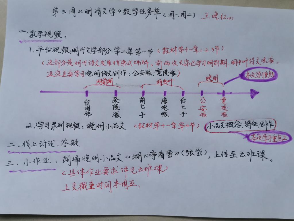 王晓红教授手书《明清文学》第三章教学任务单