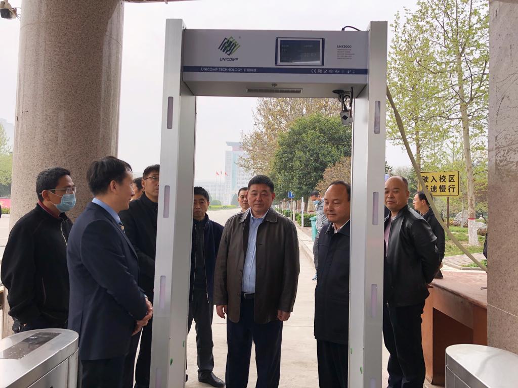 仪式结束后,卓宇、赵曼等人一行在校友赵渭鹏的悉心介绍下,一同体验了热成像式测温安检门的功能。