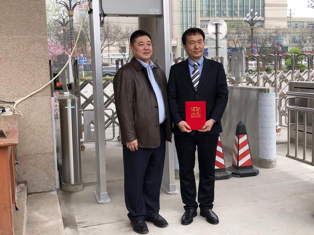 卓宇向捐赠疫情防控物资的校友、日联科技代表赵渭鹏颁发了捐赠证书。