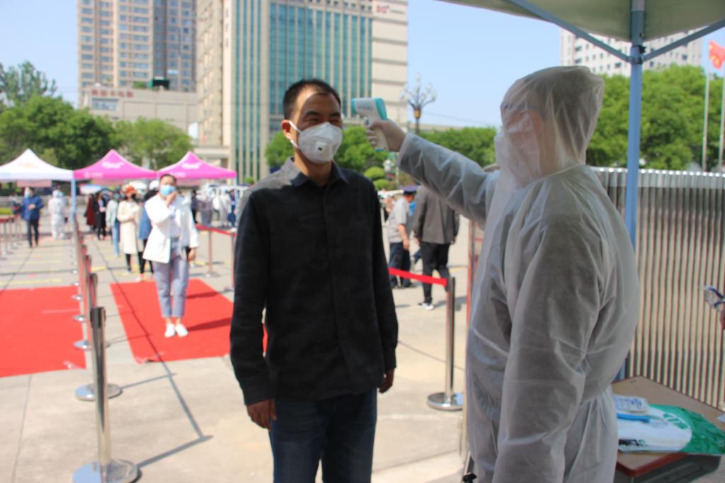 学生返校时在校门口测量体温的场景