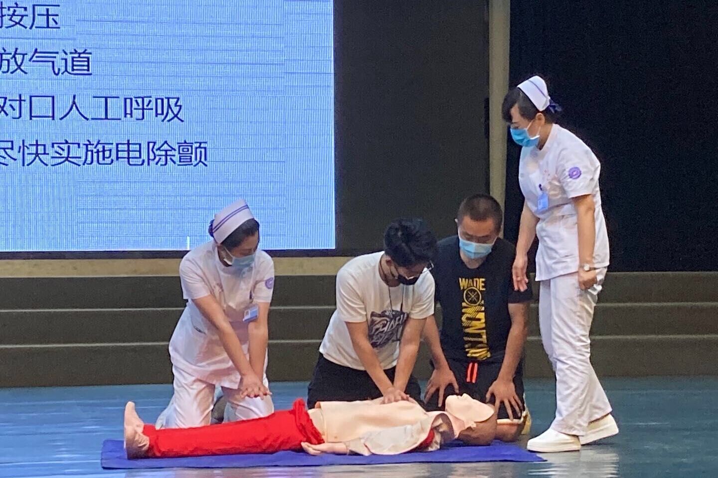 最后由关月丽护士长对心肺复苏的急救技能进行了系统全面的讲解和演示。她通过新闻报道运动员猝死的事件举例,告诉大家猝死离我们并不遥远,学会心肺复苏急救知识和技能极其重要。关护士长从心肺复苏的时效性、如何识别心脏骤停、心脏骤停处理原则、如何规范进行心肺复苏的操作几个方面作以重点讲解。此外,她还强调了心肺复苏的及时性,从发现患者晕倒的4~6分钟内必须采取诸如“轻拍重唤确定有无意识”“观察判断有无呼吸”“及时拨打求救电话”和“触摸颈动脉确定心跳情况”等急救措施,以及在校大学生需要加强CPR培训等内容。在演练阶段,同学们跃跃欲试,二院的医护团队结合人体模型现场演示了心脏按压的部位、频率、幅度以及按压与通气比,并指导学生进行了实际操作。“人人会急救,急救为人人”的演练氛围,提高了同学们学习兴趣,提升了应急自救互救能力。
