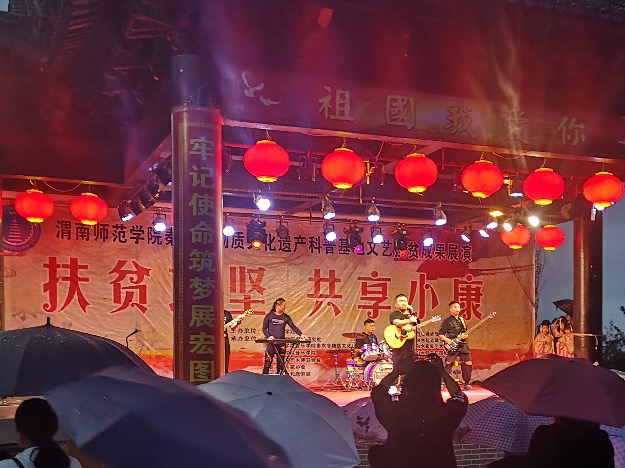 本次演出节目内容丰富、阵容强大,演出精彩,用时一个多月,围绕“白水仓颉文化”进行打造和设计,节目大多是由秦东非物质文化遗产科普基地精心组织筹备编排,并广泛采用电声、民乐、舞蹈、诵读等演出方式,弘扬伟德官网师生在白水县“精准扶贫”中展现出的精神,给脱贫攻坚工作带来极大的鼓舞。演出伊始,一曲深情的《幸福中国一起走》拉开整场演出的序幕,原创节目《向梦想出发》采用电声乐队的演出形式展示了白水县“脱贫攻坚、共享小康”的筑梦精神,独唱《仓颉颂》唱出了仓颉造字的魅力,以精准脱贫为题材的诗歌朗诵《丰碑》,歌颂了脱贫攻坚从根本上改变了贫困户的生活现状、助推农村经济发展、提升群众幸福生活指数,二胡齐奏《赛马》《喜洋洋》、古筝齐奏《礼仪之邦》、琵琶二重奏《渭水情》等民乐演出融入厚重的仓颉礼仪文化,将整场表演活动推向高潮,博得阵阵掌声。整台演出气氛热烈,体现了“一县一品,一校一特色”,得到白水县当地扶贫干部和老百姓的一致赞赏,淅淅沥沥的小雨阻挡不了所有工作人员和演职人员的热情,很多村民冒着小雨前来观看。展演活动弘扬积极进取的社会正能量,宣传脱贫攻坚阶段性成果,充分显示秦东非遗科普基地对传统音乐文化发展的推动能力,增强了白水人民热爱传统文化,热爱家乡的情感。