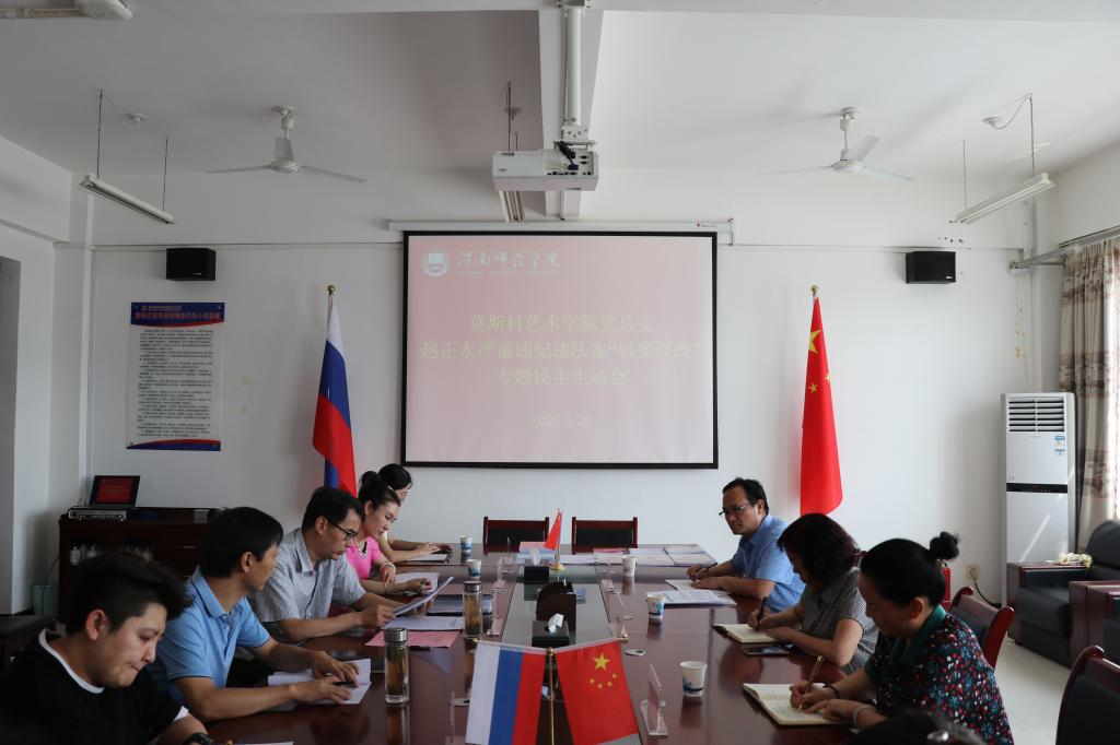 8月28日下午,莫斯科艺术学院于逸夫楼六楼会议室召开赵正永严重违纪违法案以案促改专题民主生活会,校党委委员、副校长王菊霞在学校第五督导组赵铁流、朱芳转的陪同下到会指导,学院领导班子成员、党总支委员、各党支部书记参加。会议由党总支书记席景奇主持。