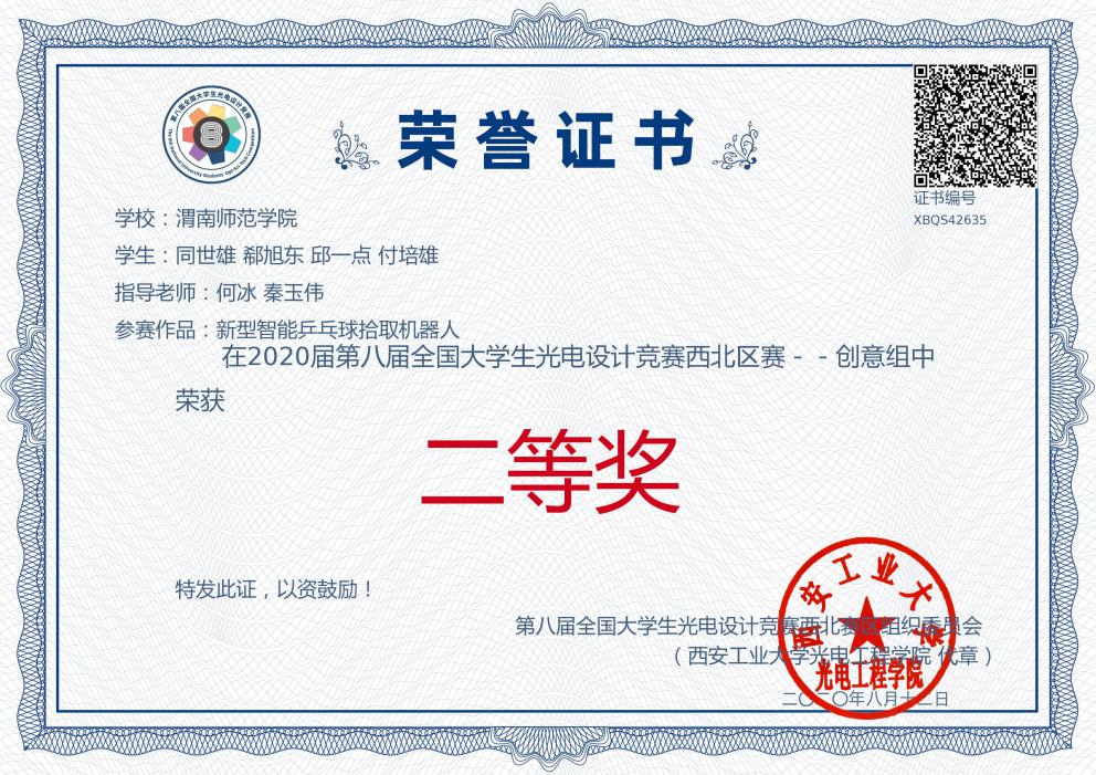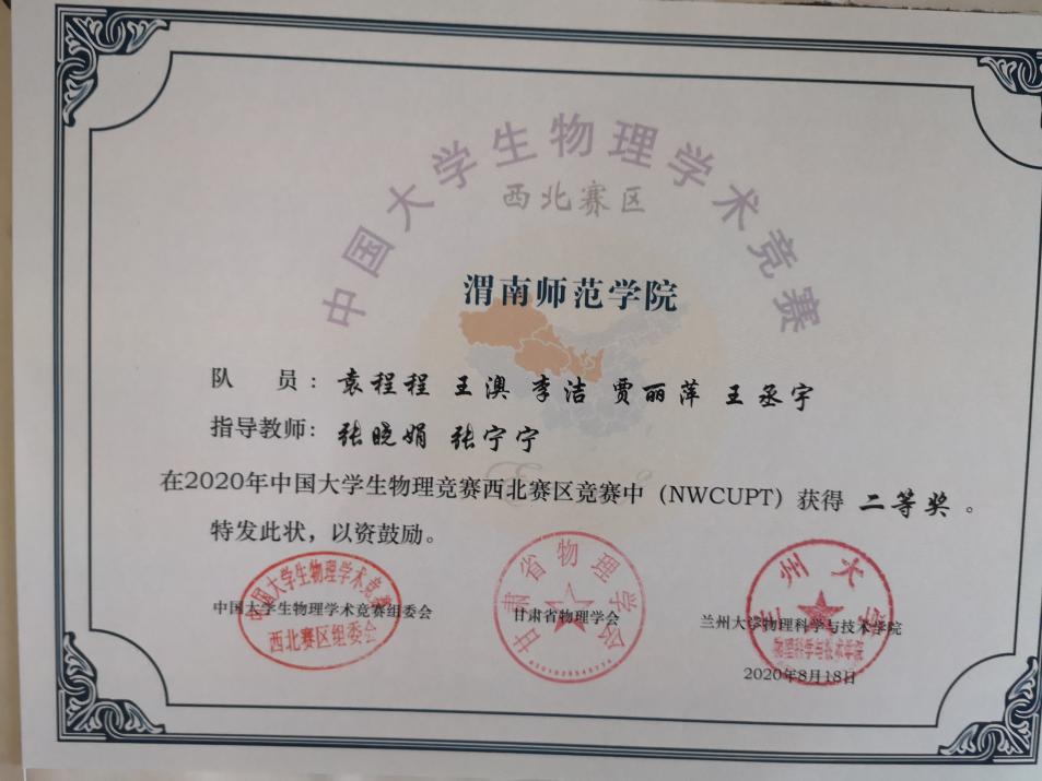 近日,由伟德官网物理与电气工程学院教师张晓娟、张宁宁指导,学生袁程程、王澳、李洁、贾丽萍、王丞宇组成的渭南师范代表队在2020年中国大学生物理学术竞赛(西北赛区)中荣获二等奖。由何冰、秦玉伟老师指导,李芳菊老师担任领队,学生同世雄、郗旭东、邱一点、付培熊组成的伟德国际1949官网代表队的参赛作品“新型智能乒乓球拾取机器人”在众多高校中脱颖而出,荣获第八届全国大学生光电设计竞赛创意组二等奖。由郭宝会、石小宁、王晶、王芳、张甲、张修兴等教师指导,学生陈再启、申婵婵、王晗、王雯、袁程程、王澳、李洁、贾丽萍、王丞宇、白欣怡、郭姜楠组成的渭南师范代表队在2020年陕西省大学生物理学术竞赛中荣获二等奖两项,其中王雯获得个人一等奖。