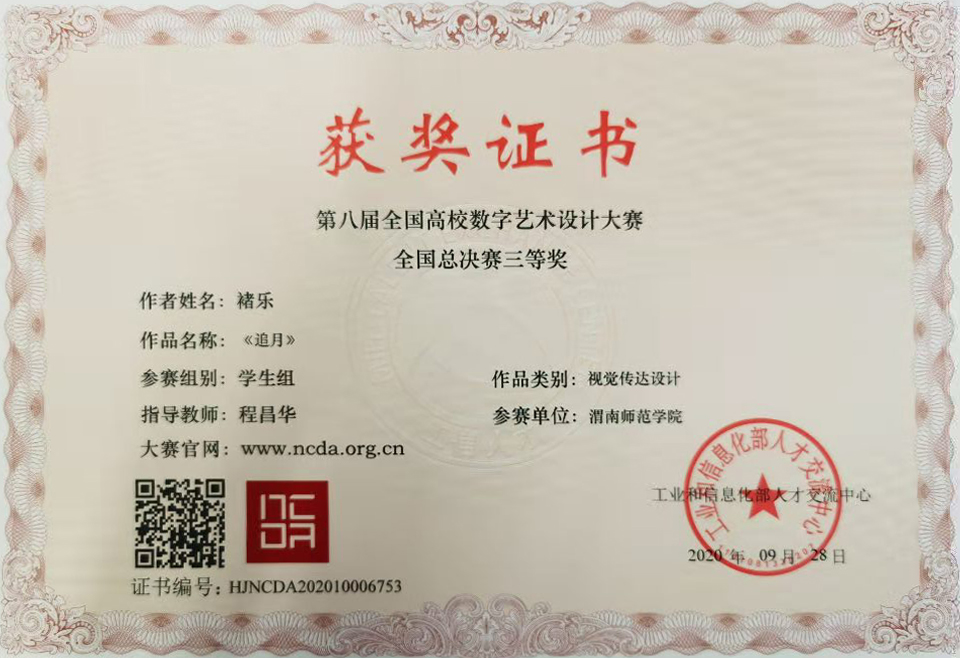 经过校赛、省区赛与国家赛的激烈角逐,由传媒学院教师赵书英指导,梁志宾、谢遵明、何杨威、张凡、于欣跃等同学创作的《塬上三宝》获得全国总决赛一等奖;由张小波指导,孟星星、王贝贝、余鹏涛、郭博耿等同学创作的《卖油翁》获得二等奖;由程昌华指导,褚乐同学设计的《追月》获得三等奖。