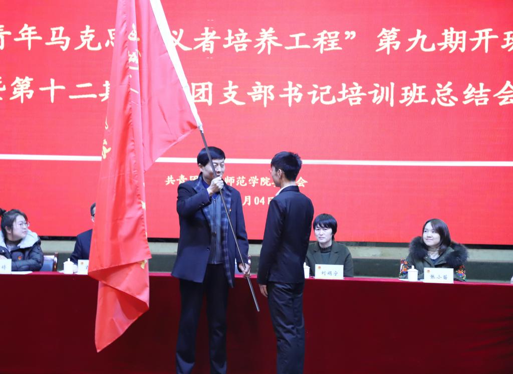 校党委副书记任健为“青马”九期培训班授旗,“青马”学员余雷代表九期学员接旗。