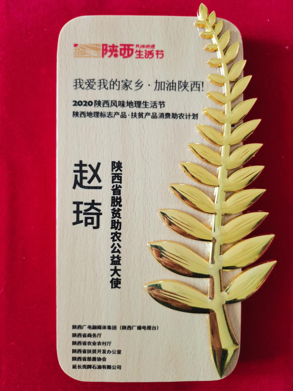 近日,“我爱我的家乡·陕西风味地理生活节”在西安市高新区嘉会国际交流中心开幕。伟德官网驻大荔县安仁镇龙门村第一书记赵琦在活动现场被授予“陕西省脱贫助农公益大使”荣誉称号,并参加网络直播,推销“带货”,助力产业脱贫、消费扶贫。