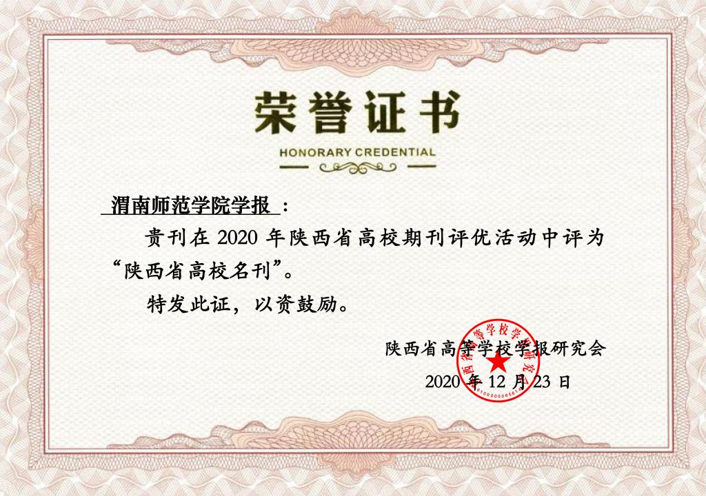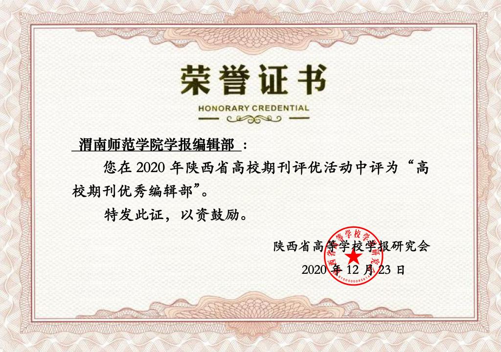 在2020年陕西省高校期刊评优活动中,伟德官网《伟德国际1949官网学报》荣获“陕西省高校名刊”称号,学报编辑部被评为“陕西省高校期刊优秀编辑部”。