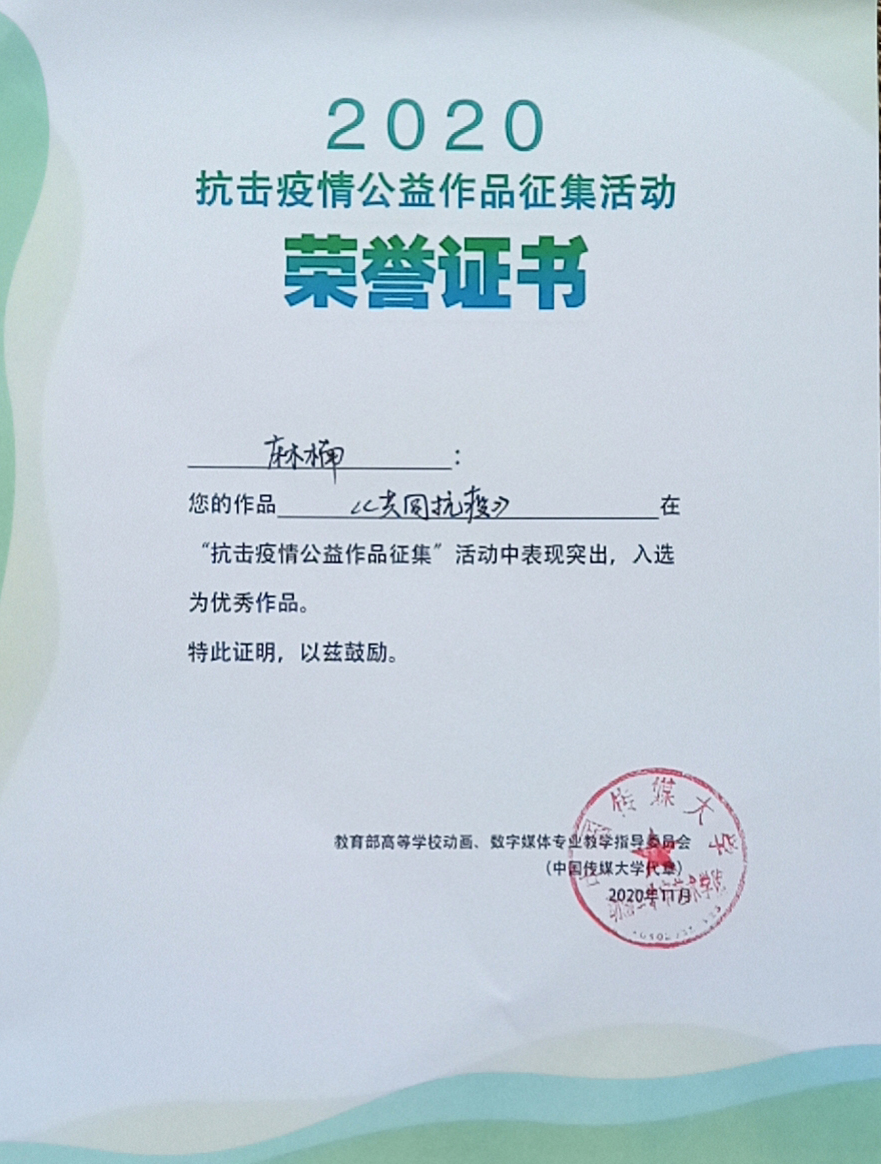 近日,教育部高等学校动画、数字媒体教学指导委员会发布了《抗击疫情公益作品征集活动百部优秀作品名单》,由伟德官网传媒学院教师刘潇颖指导、数字媒体艺术专业学生麻楠创作的《共同抗疫》荣获优秀作品奖。