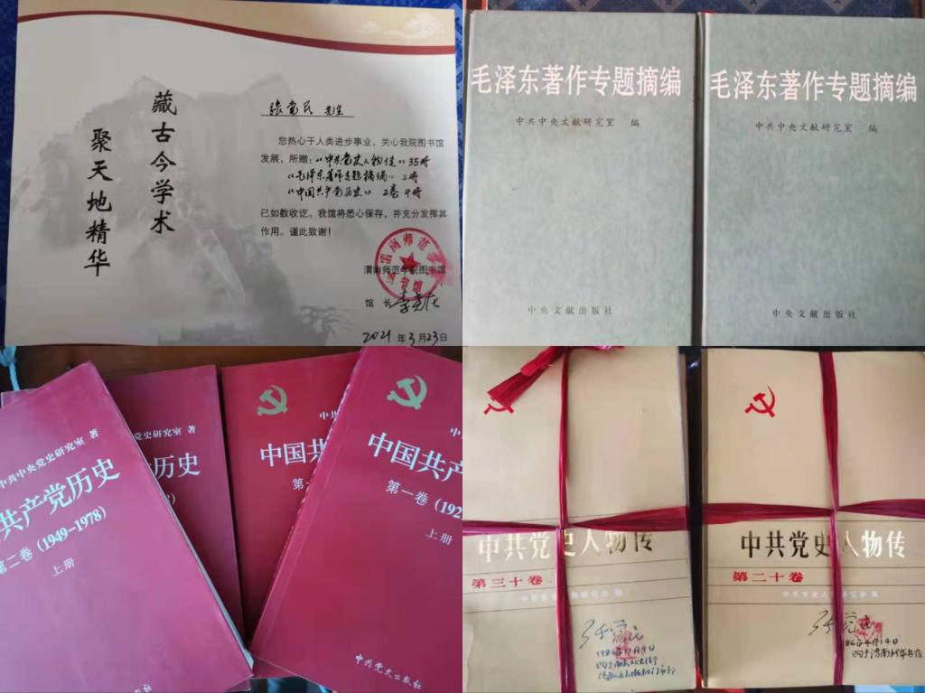 近日,伟德官网党史学习教育全面启动,张觉民听闻后深受鼓舞,决定将自己从1984年至1989年收藏的《中共党史人物传》(35本)及《毛泽东著作专题摘编》(上、下册)和《中国共产党历史》(两卷4本)捐赠给学校图书馆,让更多青年学生了解中国共产党的历史和中国共产党杰出代表的革命历程。