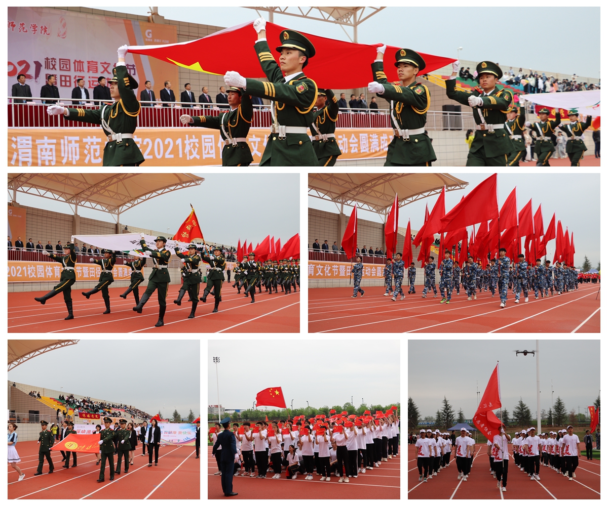 开幕式上,伴随着激昂奋进的《运动员进行曲》,国旗、校旗护旗队迈着坚定有力的步伐率先入场,经过主席台接受检阅,整齐划一,严肃庄重;彩旗队方队、裁判员方队紧随其后,精神抖擞,意气风发;各参赛代表队方阵,着装整齐,口号嘹亮,或高举展牌、或挥舞彩旗、或击鼓表演,各有特色,充分彰显了渭师师生朝气蓬勃、奋发向上的体育精神。