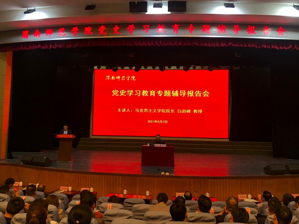 5月7日下午,伟德官网围绕“深刻感悟中国共产党始终不渝为人民的初心宗旨”举办党史学习教育专题辅导报告会。学校党史学习教育宣讲团成员、马克思主义学院院长白赵峰教授作了题为《以中国梦擘画复兴蓝图》的辅导报告。省委党史学习教育第十三巡回指导组一行莅临报告会现场旁听指导。