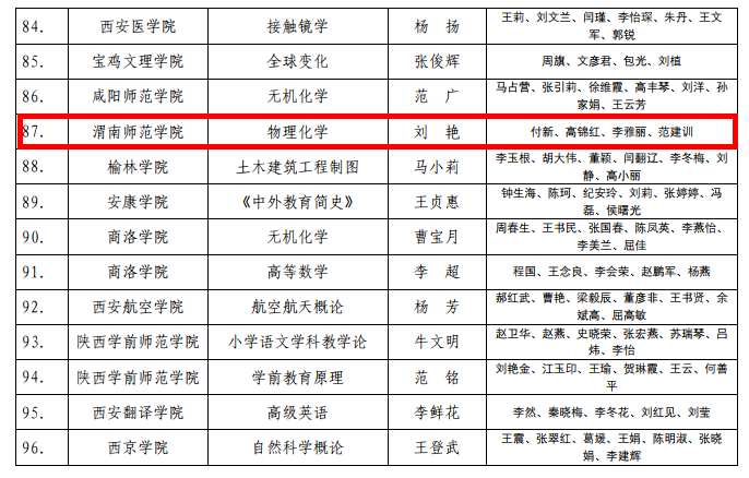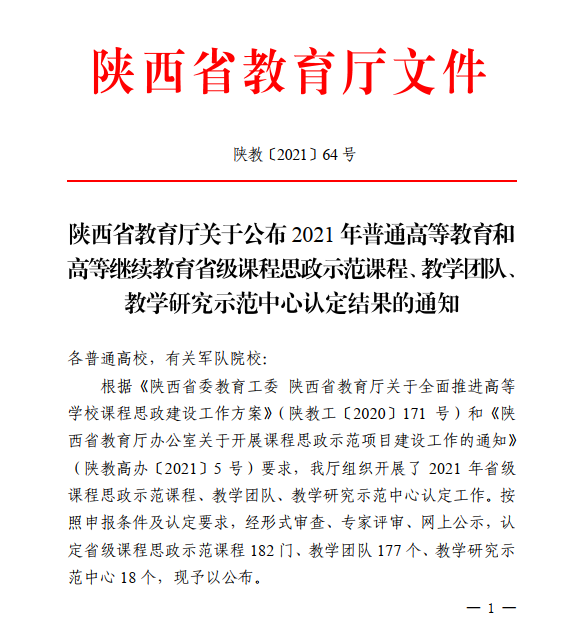 近日,陕西省教育厅公布了《陕西省教育厅关于公布2021年普通高等教育和高等继续教育省级课程思政示范课程、教学团队、教学研究示范中心认定结果的通知》(陕教〔2021〕64号)。经形式审查、专家评审、网上公示等程序,伟德官网化学与材料学院刘艳负责的《物理化学》被认定为省级课程思政示范课程,物理化学教学团队被认定为省级教学团队。