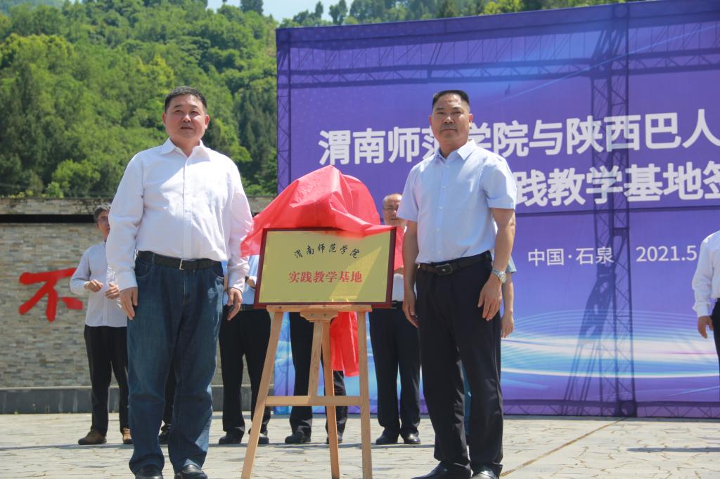 卓宇与徐家彦为实践教学基地揭牌。传媒学院院长曹熙斌、美术学院院长殷晓克分别与陕西巴人文化旅游发展有限公司总经理陈国盛签订实践教学基地共建协议书。
