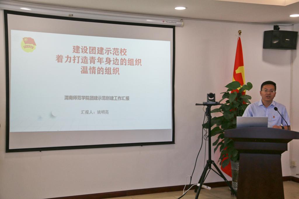 学校团委书记姚明亮从立德树人落细、实践创新拓展、校园文化品牌提升、基层组织强基固本、团学改革创新“五大工程”等方面汇报了伟德官网团建示范创建的创新举措;从青马工程、第二课堂成绩单建设两个方面介绍了伟德官网团建示范创建的特色亮点;从思想引领、组织建设、队伍建设、体制机制建设、强化服务等方面对伟德官网共青团努力的方向进行展望。省级团建示范创建工作标杆院系、马克思主义学院团总支书记杨应楠围绕从严治团、加强思想引领、打造团属活动品牌、筑牢网络工作平台阵地等方面对标杆院系的创建工作进行汇报。学生党员代表、教育科学学院学前教育181班刘静,学生团员代表、数学与统计学院数学与应用数学181班周宇甜分别从“青马”学员心得体会、公寓团组织学生干部的主要任务等方面做了分享交流。
