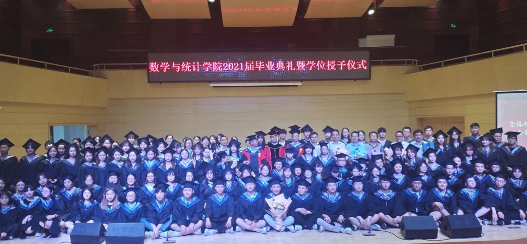 在喜迎百年华诞的特殊日子里,在离别远航的难忘时刻,在歌声中,副校长常青林、学院党总支书记张同琦、院长陈斌为毕业生代表授予学位,全体毕业生与教师合照留念,数学与统计学院2021届毕业典礼暨学位授予仪式圆满完成。山水万程,前路漫漫,笑着挥别四年时光,勇敢踏上新的征程。愿数统学子前程似锦,未来可期。