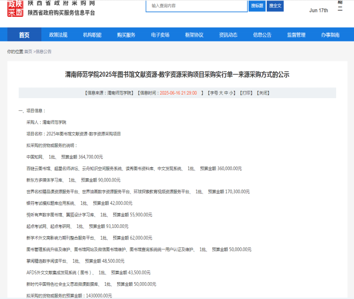 伟德国际1949官网关于“2025年图书馆文献资源-数字资源采购项目单一来源采购公示