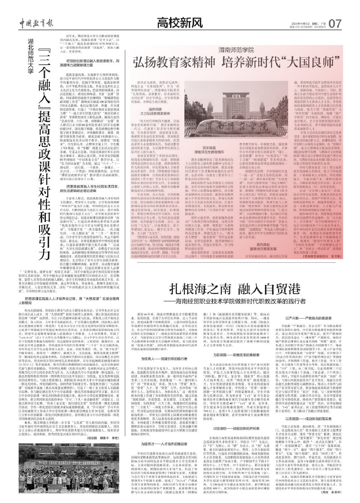 强化情怀教育。在培养未来教师的过程中,学校将教育家精神渗透到教育教学的每一个细微之处,强化师范生师德养成和教育情怀培养,开展中小学名师名校长给师范生“同上一堂思政课”和举办“红烛讲坛”“园丁之歌”“师魂影院”等系列活动,让教育家精神如春风化雨般滋润每一名师范生的心田。