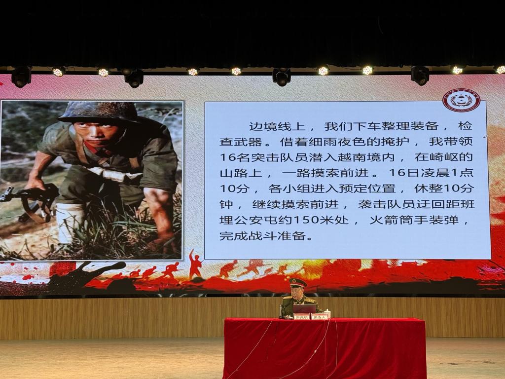 英雄主题报告:功勋者解码精神密码 跨时空传承英雄基因 罗振明以亲历的边境自卫还击作战故事诠释“无悔青春”的深刻内涵。他展示的战场照片、作战地图等珍贵资料,将师生带回战火纷飞的岁月:“当炮弹在身边爆炸时,战友们想的不是后退,而是如何完成任务、守住阵地。”这是军人战斗精神的生动注脚,引发全场对“青春何为”的深度思考。